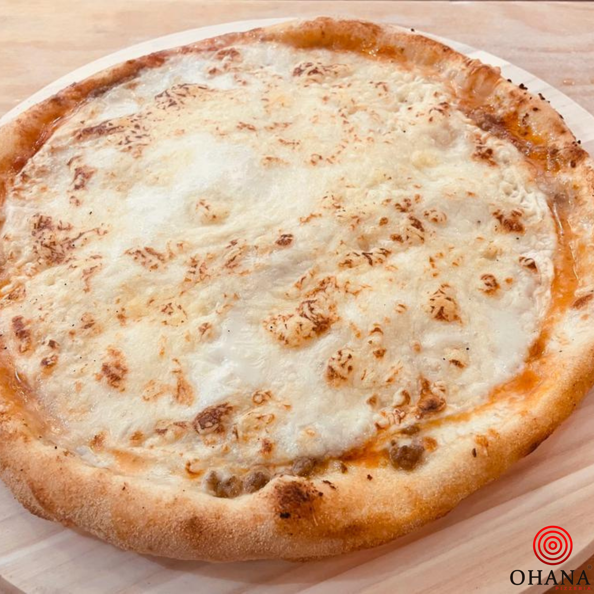 La pizza Bolosaña de Ohana es una explosión de sabores y texturas que no podrás resistir. Con una base de salsa de tomate fresca y mozzarella Fior di Latte, se adereza con una generosa capa de doble carne de ternera picada, creando un sabor jugoso y suculento. Sobre esta mezcla se coloca una torta de trigo, que aporta una textura única, y se cubre con una suave bechamel que le da cremosidad. Finalmente, se gratina con queso, creando una capa dorada y deliciosa. ¡Una pizza potente, llena de carácter y sabor que te sorprenderá en cada bocado!
