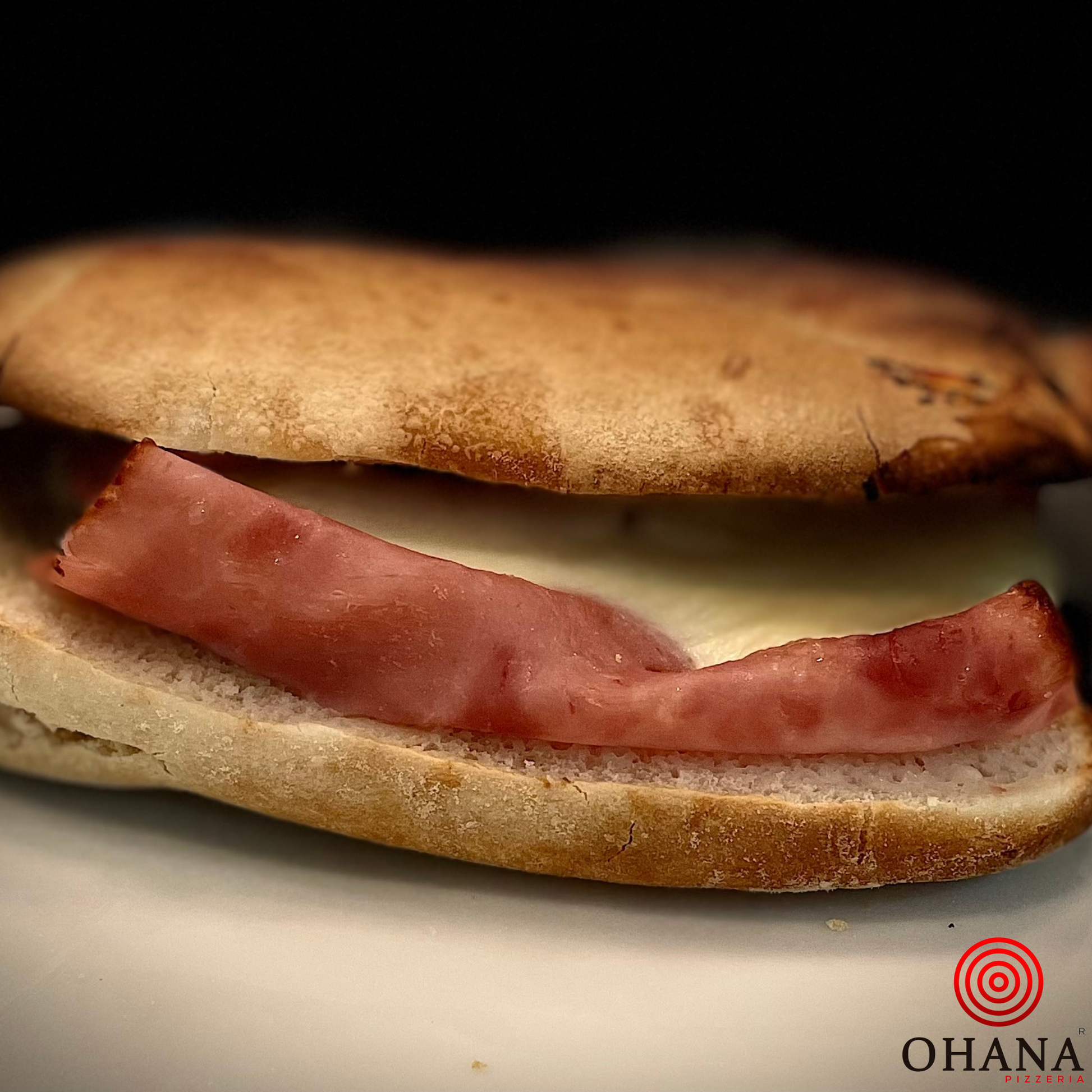 El Mollete Ohana York Queso es la combinación perfecta de sencillez y calidad. Con pan de mollete de Antequera, se rellena con jamón York de nuestro carnicero de confianza y mozzarella fior di latte. Todo se hornea en nuestro horno de pizza, logrando un acabado dorado y un sabor irresistible. Ideal para los que aprecian lo clásico con un toque especial.
