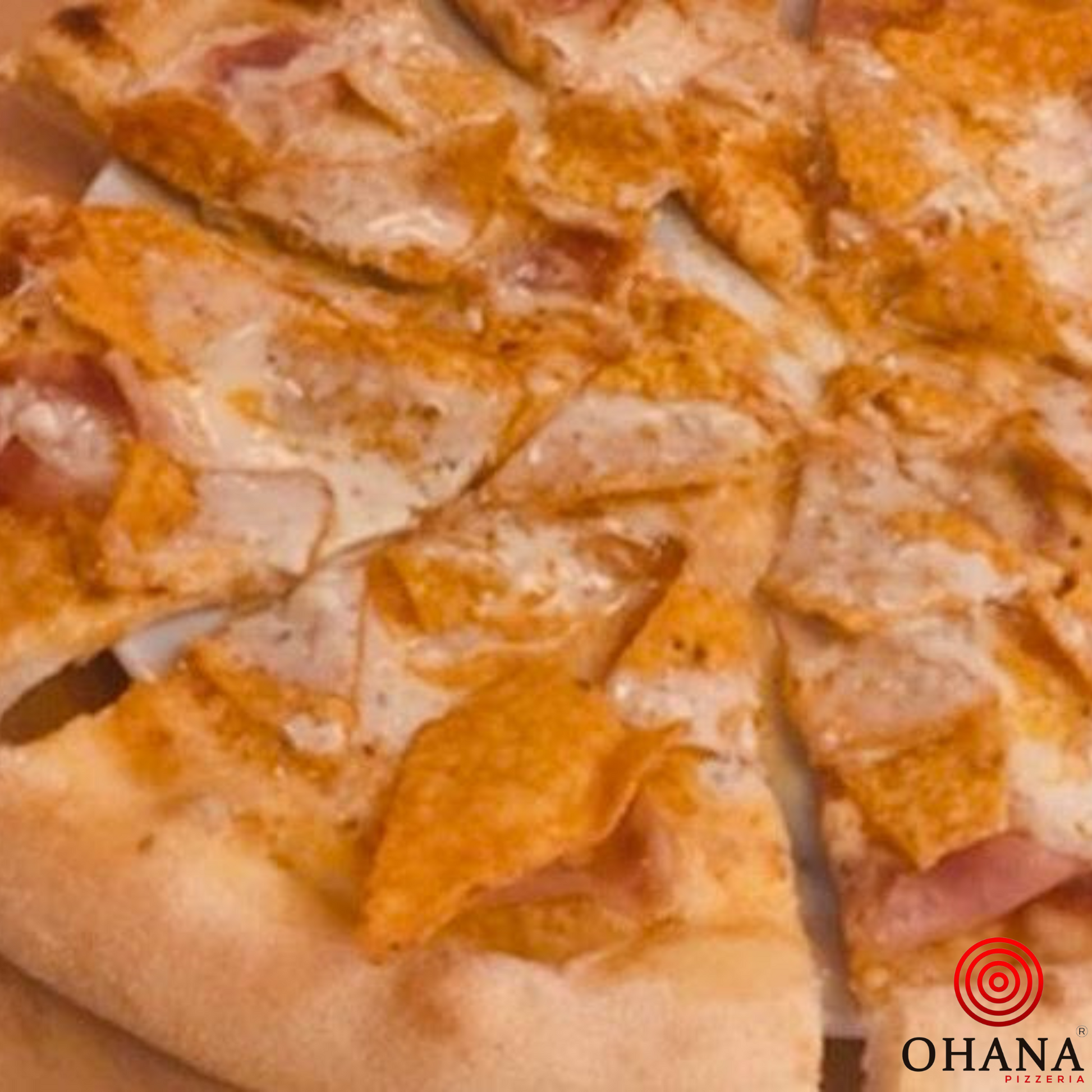 La pizza Dori de Ohana es una explosión de sabor con salsa de tomate y mozzarella fior di latte como base, cubierta con carne picada de ternera y bacon crujiente. Al salir del horno, se añade un toque único de auténticos Doritos y nuestra salsa secreta de quesos, creando una combinación irresistible de texturas crujientes y cremosas, con un sabor profundo y delicioso. ¡Una pizza fuera de lo común!